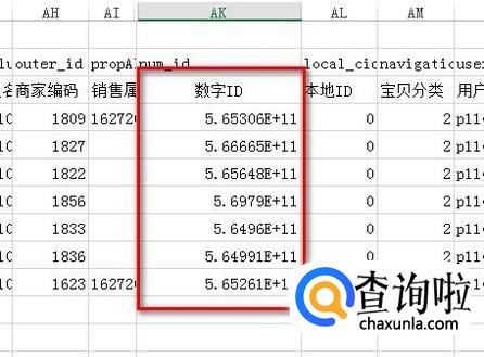 因为商品id的字数已超出了电子表格所规则的字符数,现在,我们看到的不是完整的商品id;我们可以这样操作:把这一列单元格全选中,再设置单元格式为没有小数的数字格式,那么,完整的商品id就显示出来了。