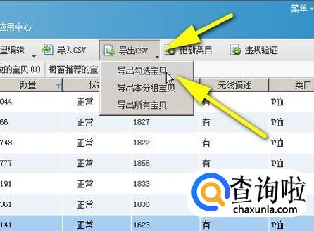 再点击上面“导出csv"下拉按钮,弹出的下拉菜单中再点“导出勾选宝贝”