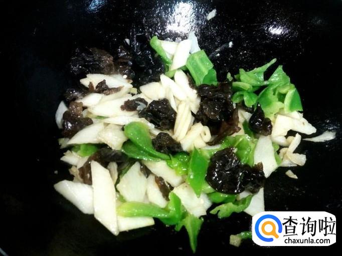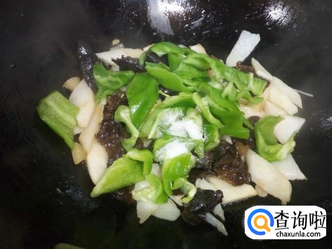 炒至木耳变软,透明,放入青椒翻炒,放入盐。炒至青椒断生,放入少许味精,关火出勺。