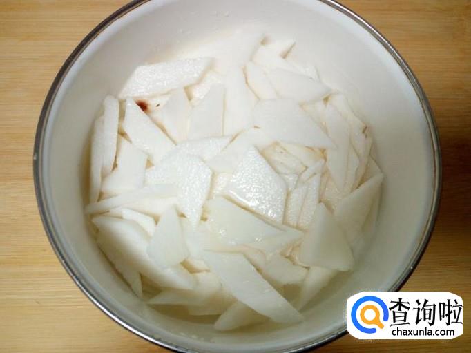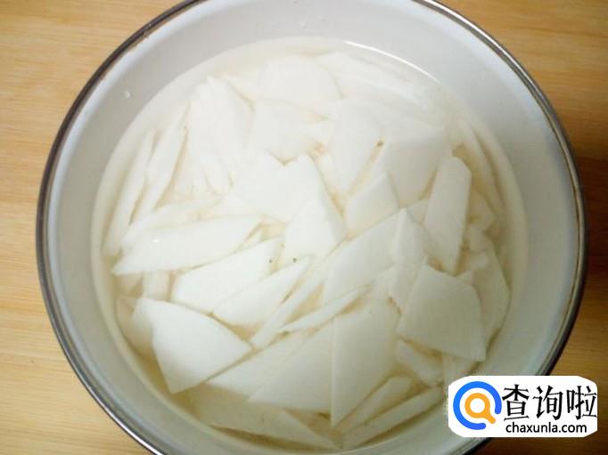 山药去皮,用水清洗干净,控干水分,切成片。放入水中浸泡一下,然后再用水投洗干净,控干水分。