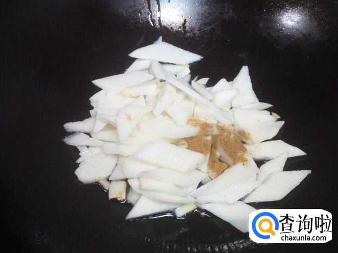 锅里放入油加热,油热后放入葱,姜,蒜爆锅,放入山药翻炒,放入五香粉,少许料酒,滴少许醋。