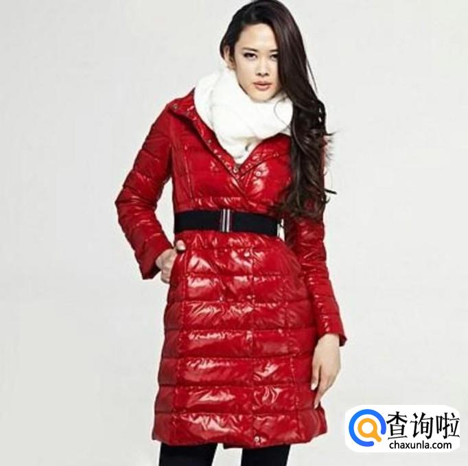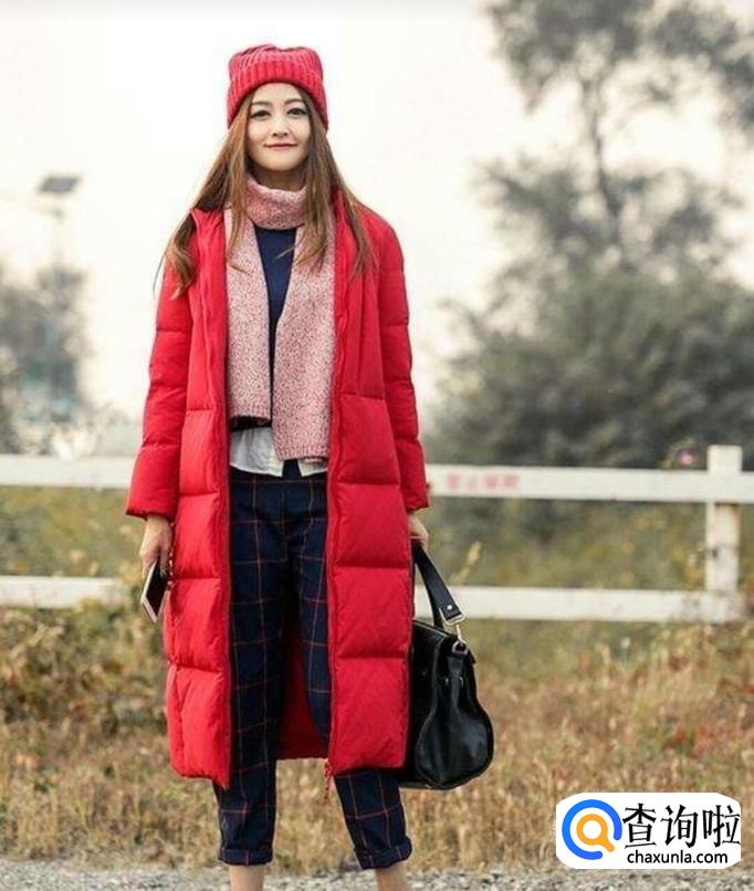 搭配黑色毛线围巾。红色的羽绒服搭配黑色的打围巾大气端庄。