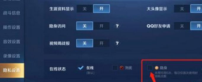 首先点击游戏主页面右上角的设置齿轮,进入设置界面;在设置界面的左侧下面有一个隐私设置,点击隐私设置;找到在线状态,勾中隐身,点击确定即可;开启隐身状态后,好友将视玩家作离线,且无法向玩家发起组队邀请。