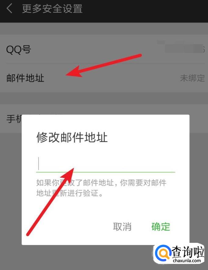 在这里,我们就点击‘邮件地址’,点击后,会弹出一个窗口,在这里输入自己的邮箱,点击确定按钮就行了。