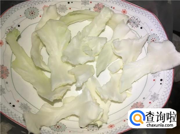 包菜把最外层的那层撕掉,然后慢慢把里面的包菜给撕开来,包菜的菜根是要摘掉的,这个菜根很硬,不好吃。
