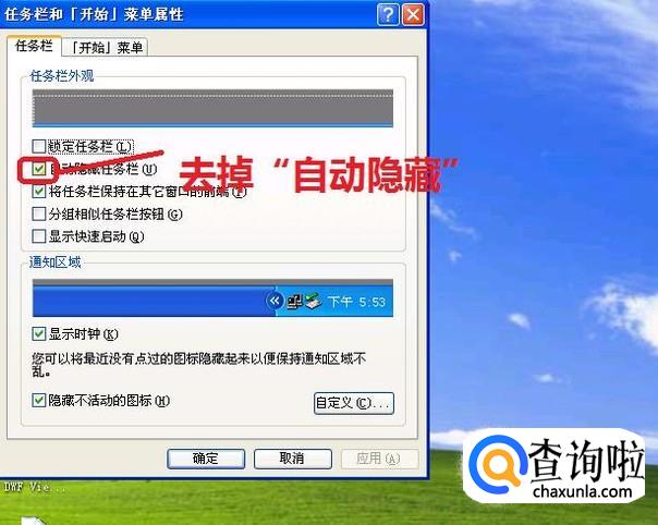 然后,如图所示,把“自动隐藏任务栏”前面的复选框去掉。