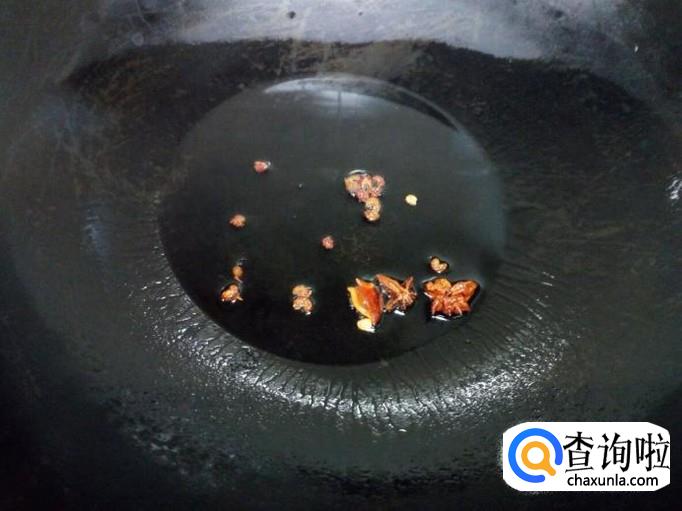 锅里放入油加热,油热后放入花椒,八角爆锅,放入五花肉翻炒。