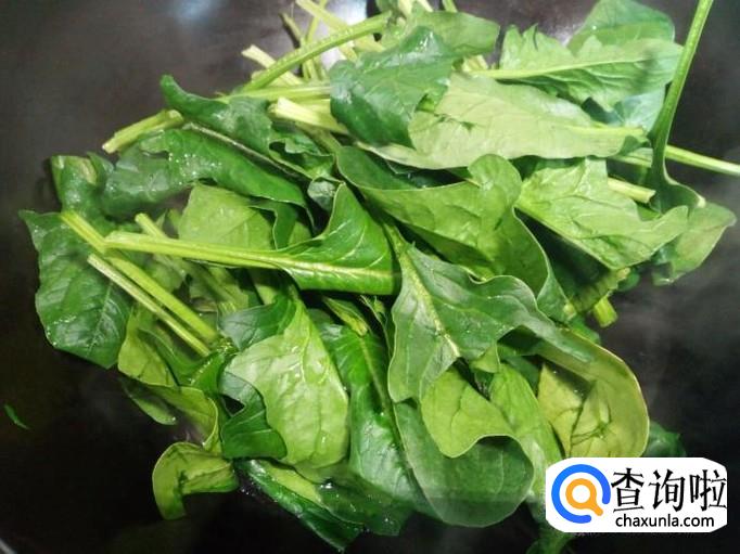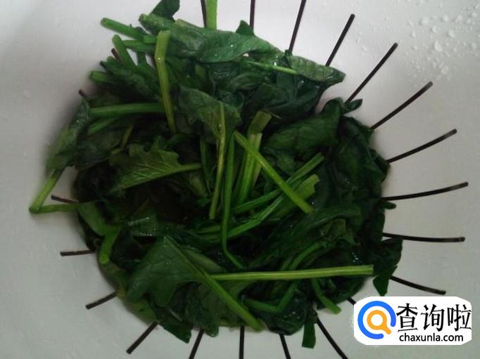 菠菜用开水焯一下,水开后入锅10秒钟捞出,迅速用冷水过凉,沥干水分。