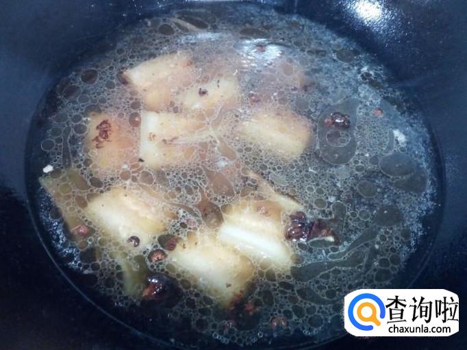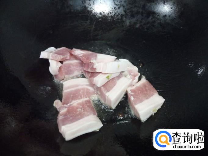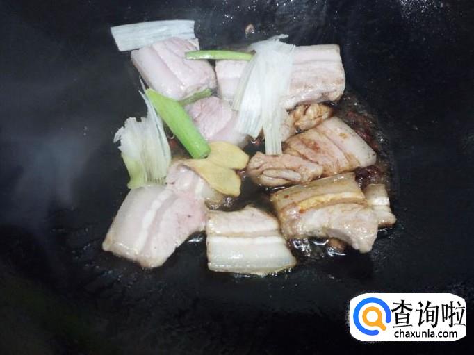 炒至五花肉下油,放入葱,姜翻炒,放入料酒,酱油。然后放入适量的水,放入盐,大火烧开,转中火慢煮。