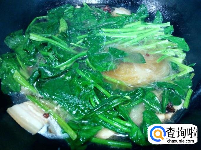 煮至4~5分钟的时间,五花肉煮熟后,放入菠菜,粉丝,转大火烧开。开锅后,放入味精,关火即可。