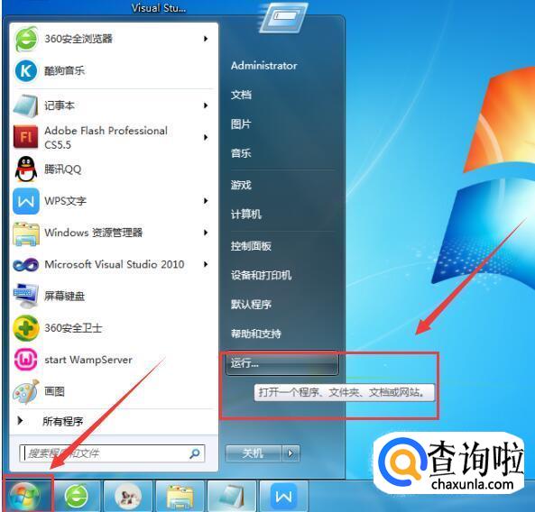 点击桌面左下角的【开始】图标,在弹出的菜单栏中,选择【运行】,如下图所示: