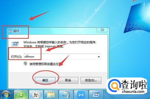 在运行窗口的输入框中,输入【ctfmon】,再点击【确定】按钮,在电脑桌面即可看到输入法图标,如下图所示: