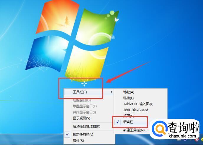 然后点击【任务栏】左侧的【语言栏】,然后桌面显示输入法图标,如下图所示:
