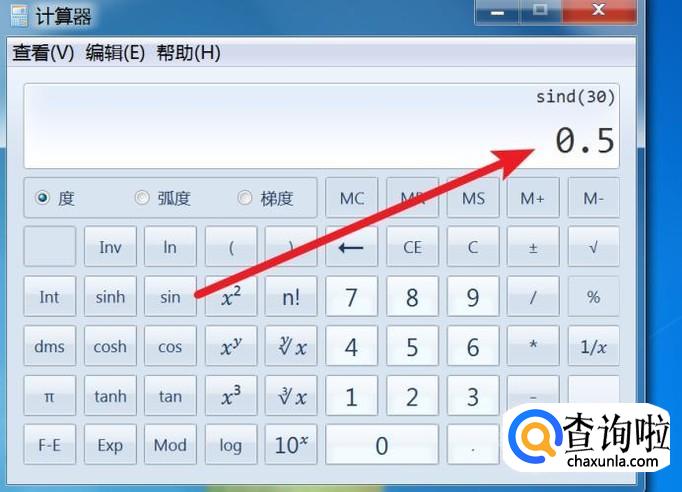 在这里我们可以使用一些复杂的数学公式,比如sin,cos等。先点击数字30,再点击sin就可以得到sin(30)的值了。