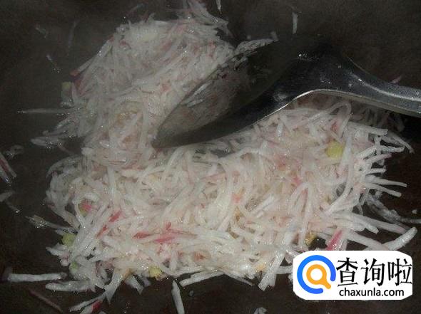 热油炒香蒜,芹菜,再加入萝卜丝翻炒,炒至七层熟,盛出备用