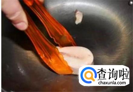 不锈钢锅放在火上,打开小火,切一块连着猪皮的猪肥肉,放进锅里,没有这样的肥肉的话,用猪大油一块就行。