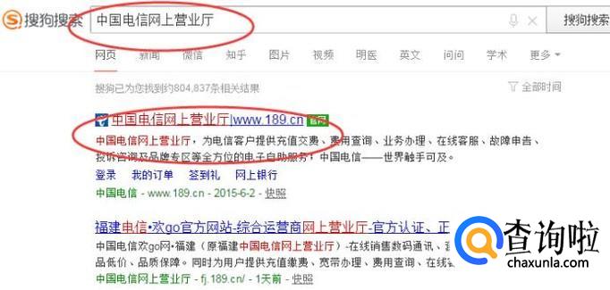 在浏览器搜索【中国电信网上营业厅】,点击相关链接,如下图所示: