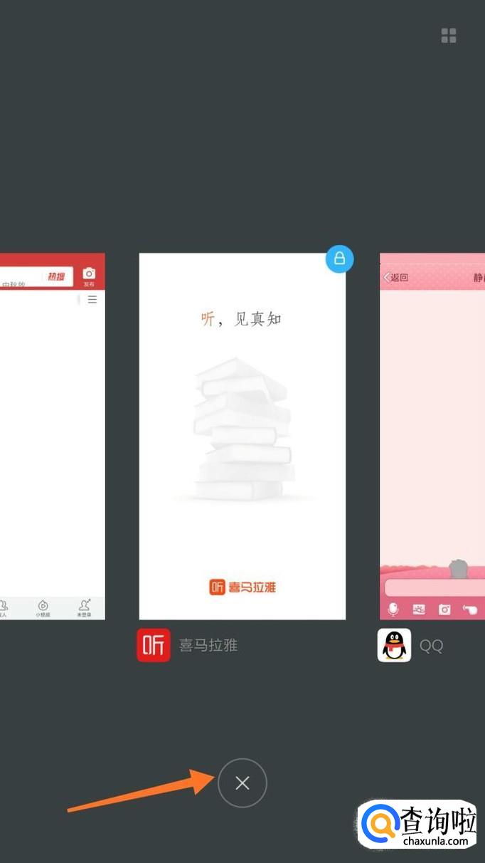 接着弹出很多应用界面的方框,如果我们只想清楚某一个应用的话,我们找到该应用后,用手指在屏幕上向上滑动即可