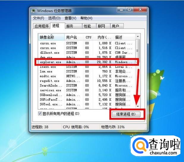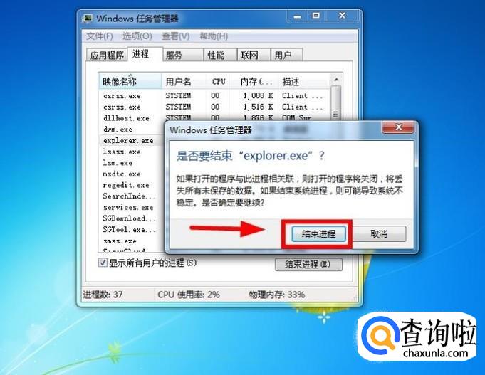 找到“explorer.exe”进程,然后结束该进程点击“结束进程”