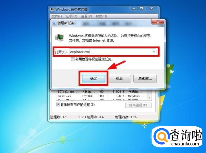 重新在窗口输入“explorer.exe”,并点击“确定”