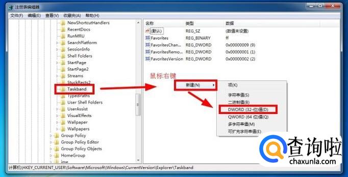 在“Taskband”选项中,在右边空白处点击鼠标右键“新建——DWORD(32-位)值”