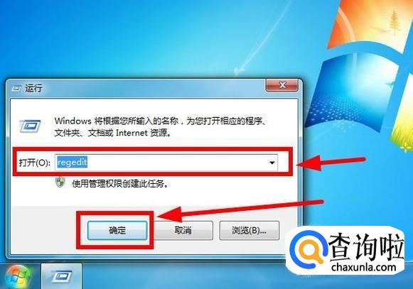 在运行对话框输入“regedit”进入注册表编辑器,并点击“确定”