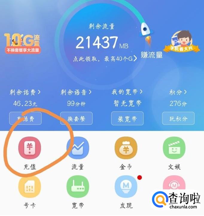 进入“和我信”的主页面之后,可以看到有一个“充值”的项目,点击进入