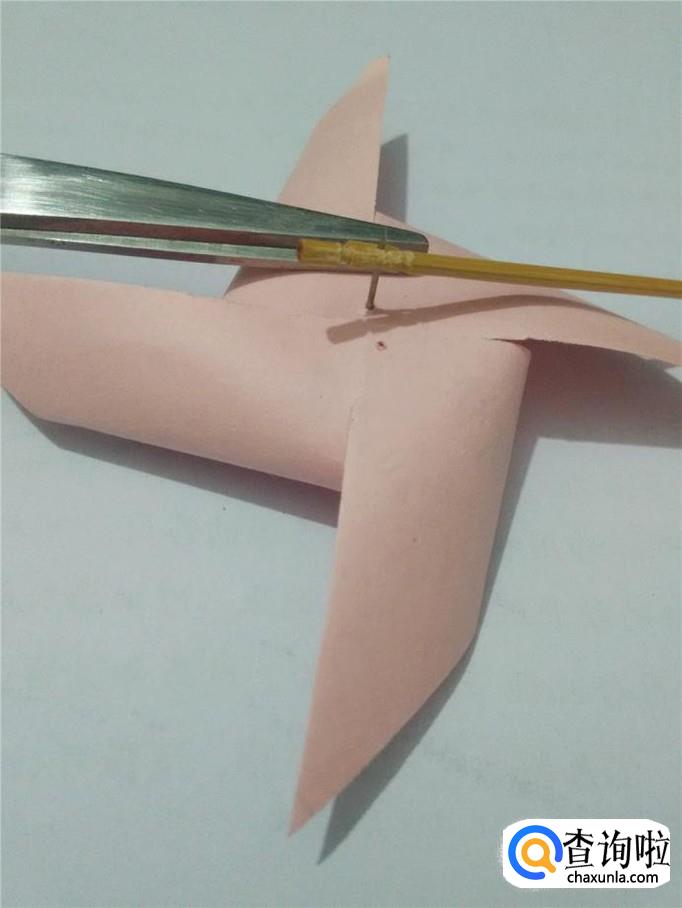 用大头针把每个相同位置的角扎穿,四个角叠在一起。