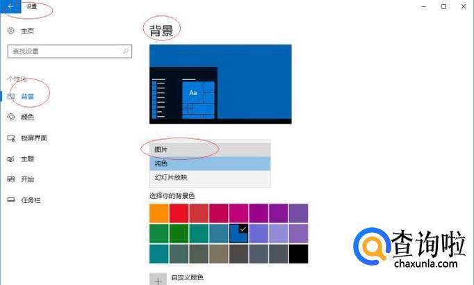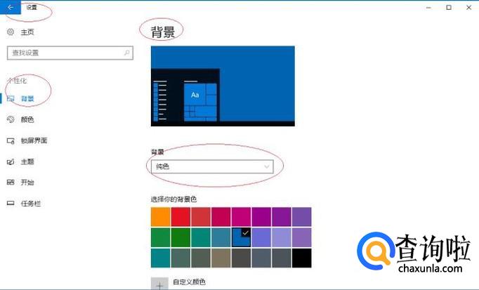 唤出"个性化"选项界面,点击"背景→纯色"文本框右侧向下箭头。