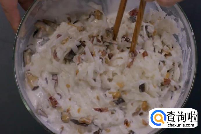 接着把粘米粉和澄粉过两次筛,倒入泡发冬菇的水,搅成稀糊状,然后全部炒好的食材,充分搅拌均匀。