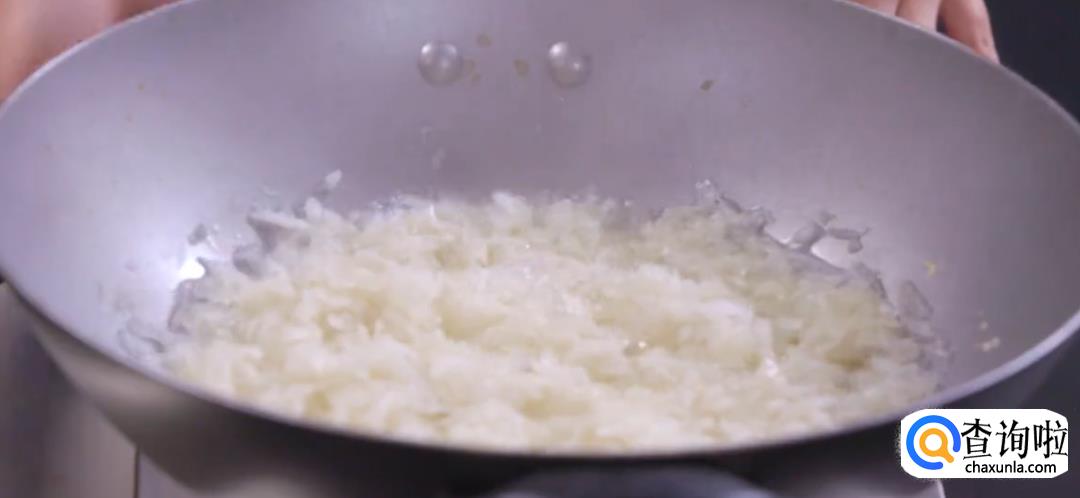 之后把锅洗干净后加入萝卜丝,加入泡发瑶柱和冬菇的水,再加入冰糖翻炒,直至萝卜变得透明熄火。