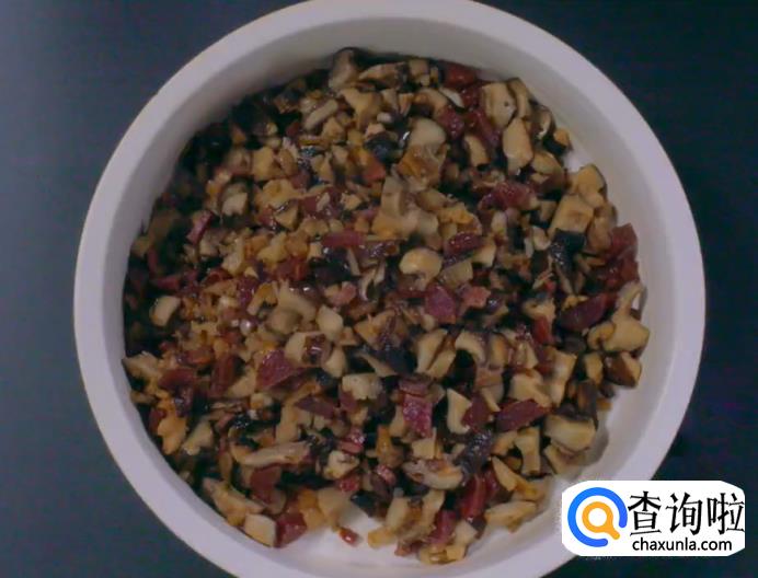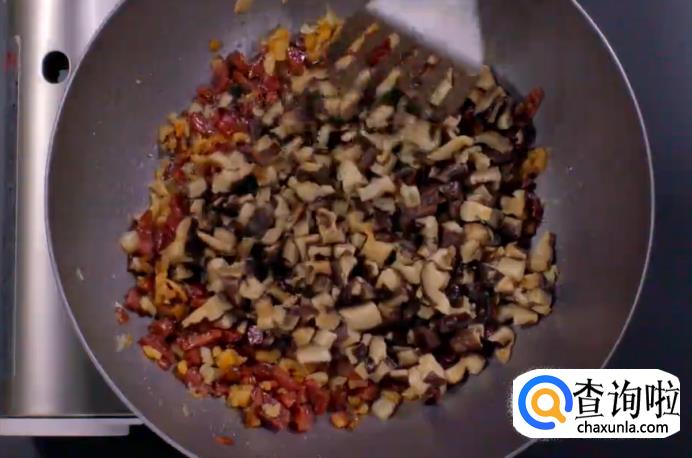 接着热锅起油,放腊肉和腊肠爆炒,等脂肪部分变得透明后,加入沥干的瑶柱和虾米碎,炒至香味溢出,在加入冬菇碎炒匀。