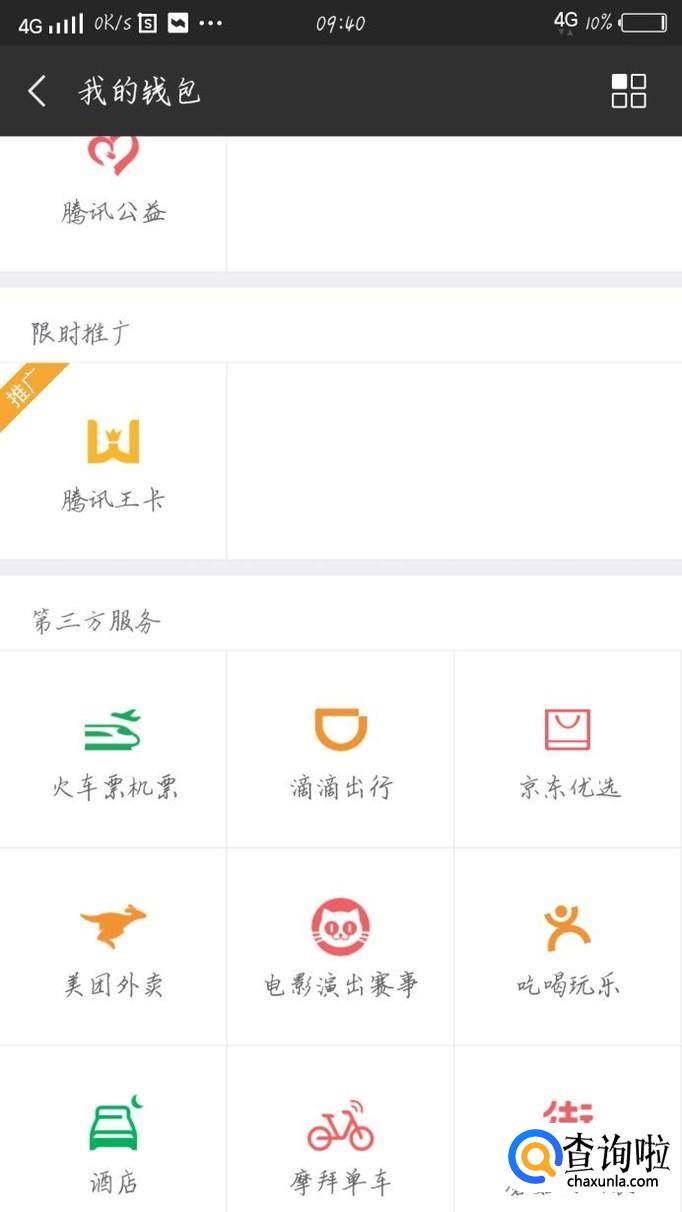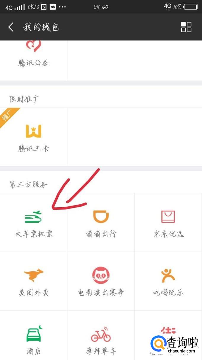 点击“钱包”这个选项,如图1箭头所示。会出现一个新的界面,如图2所示。向下滑动手机,点击“火车票机票”这个选项,如图3箭头所示。