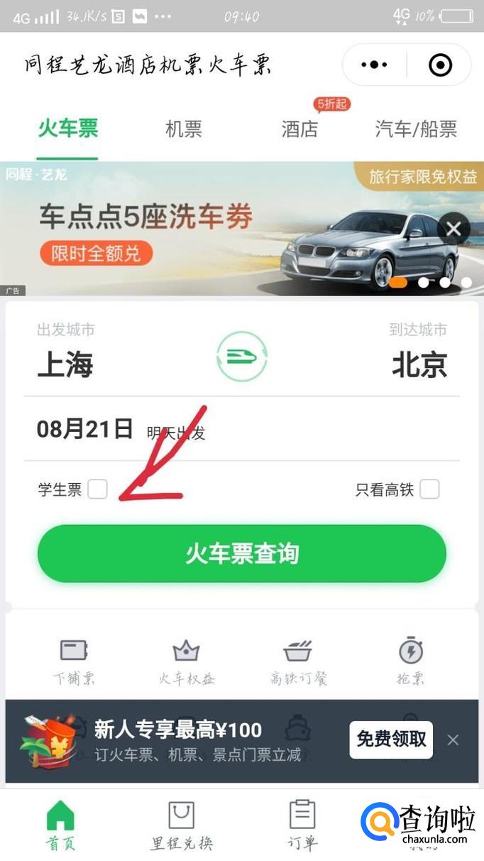 会出现一个新的界面,确定好你的目的地和出发点以及时间。再点击学生票选项,如图1箭头所示。找到你需要的时间就可以了。