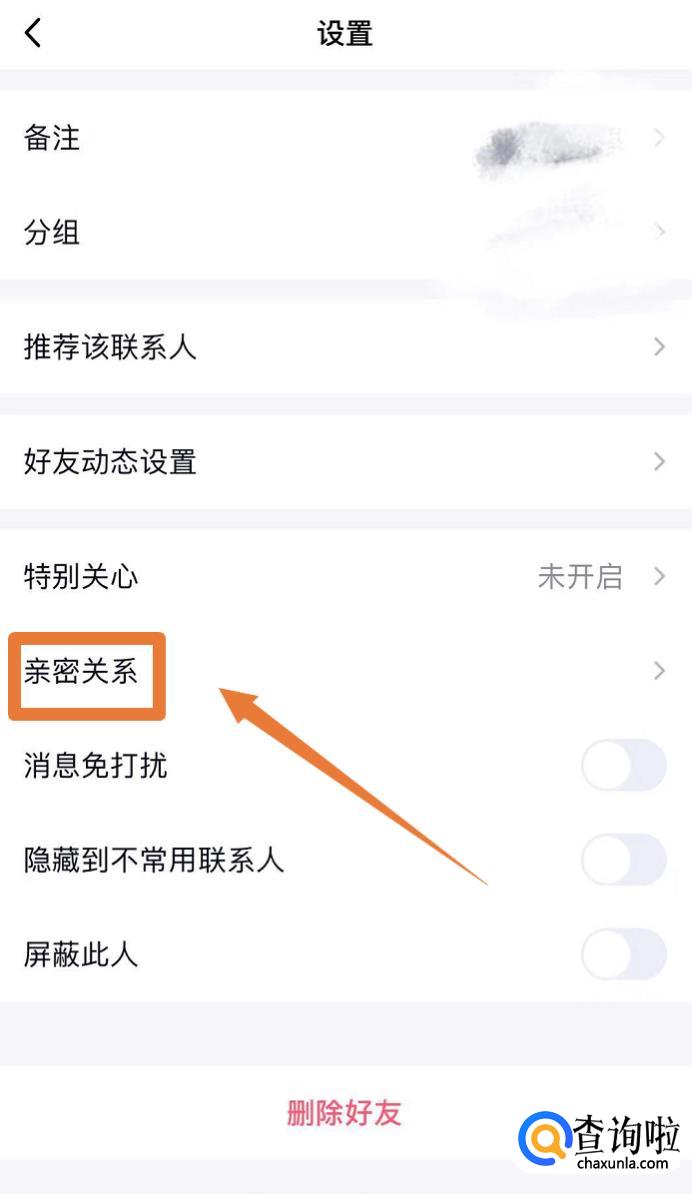 在设置当中找到亲密关系设置选项,点击进入亲密关系选择。