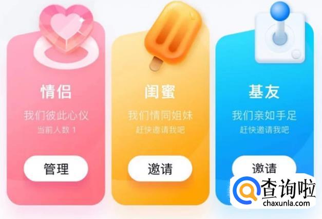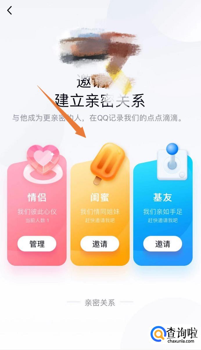 亲密关系界面显示情侣闺蜜和基友三个关系,点击下面的邀请。