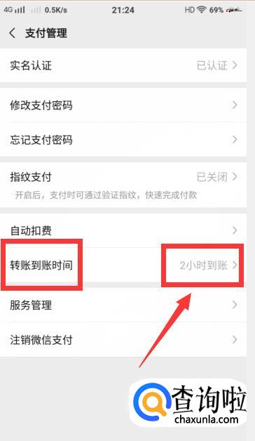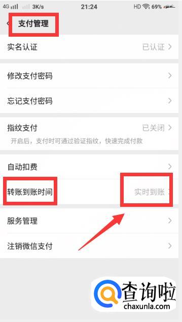 进入后,就到了【支付管理】的页面啦,在下方找到【转账到账时间】并点击进入,此时显示的是【实时到账】。
