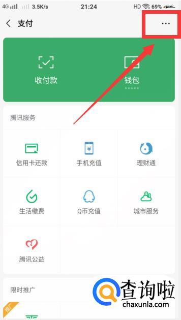 进入【支付】页面后,点击右边的【…】的图标并进入。