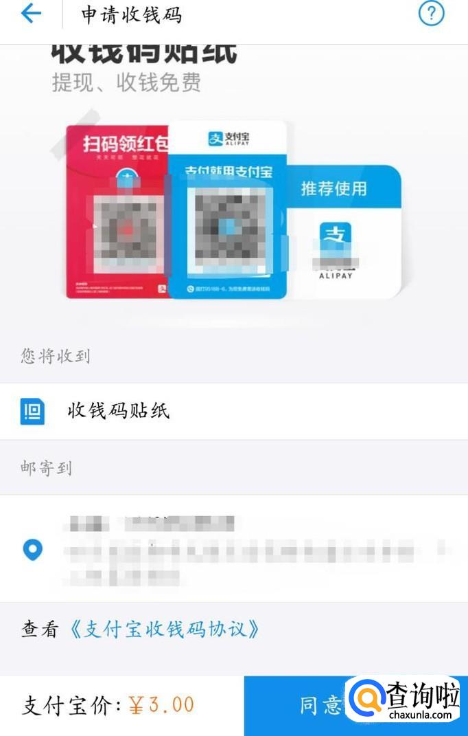 阅读协议,填写你的收货地址,电话,点击同意并申请,然后支付3元,即可获得收款码。