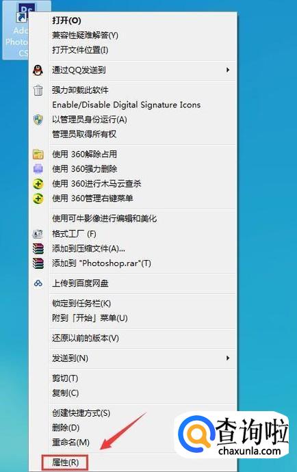 首先我们在桌面上找到ps的快捷图标,然后单击鼠标右键找到属性选项,如图所示: