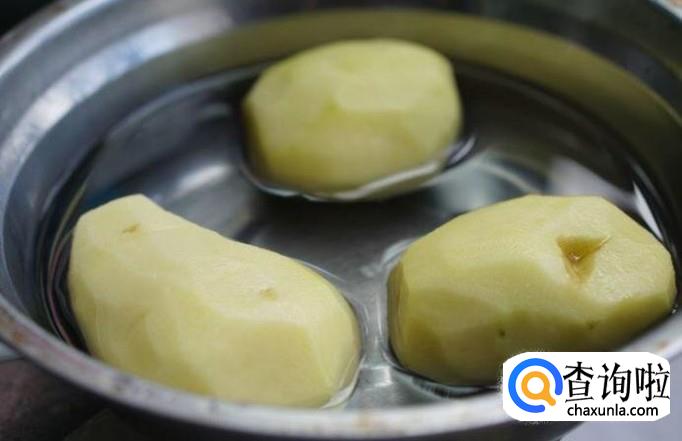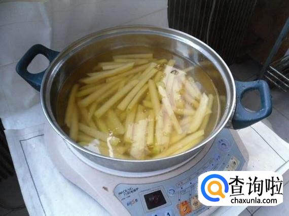 然后把切好的马铃薯过水煮,大致煮熟后用凉水过一下,然后备用,这个时候我们可以给马铃薯条上面裹上一层面粉(面粉也可以不用)