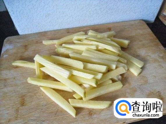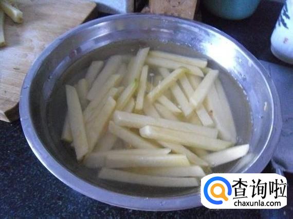 然后把洗干净又去皮的马铃薯切成一条一条的形状,切完以后用清水浸泡一段时间,以免与空气接触变黑。