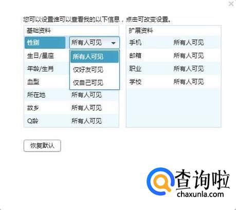即可通过选择,将个人的基本信息设置成“仅好友可见”,则是向陌生人隐藏自己的基本信息;设置成“仅自己可见”,即向所有人隐藏自己的基本信息。