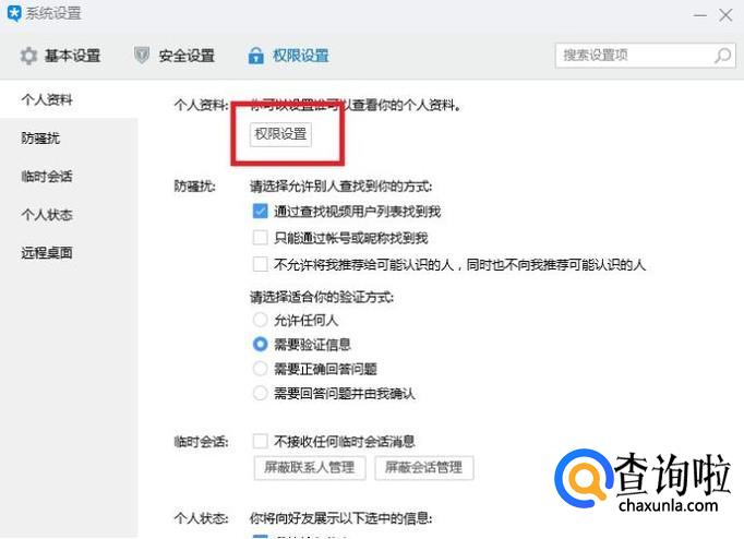 个人资料的相关设置中,点击对应的“权限设置”。