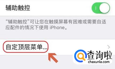 在辅助功能界面,将其中的“辅助触控”这一功能选项打开,然后点击该页面中的“自定顶层菜单”;