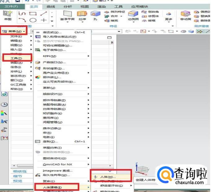 我们之前多次使用UG都是【插入】,没想到这个“人体建模”命令竟然是藏在【工具】下面。