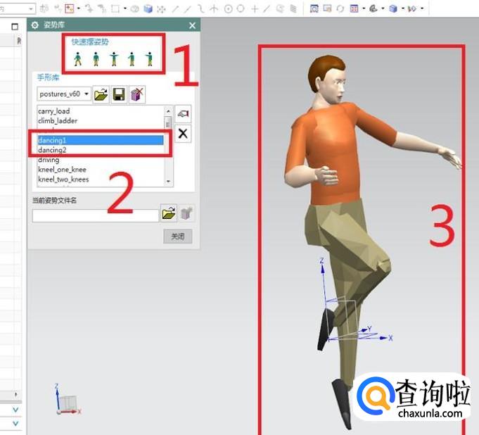 姿势选择完毕,点击“关闭”就可以了,然后它就保持着我们所选的跳舞(dancing)的姿势。如下图所示。