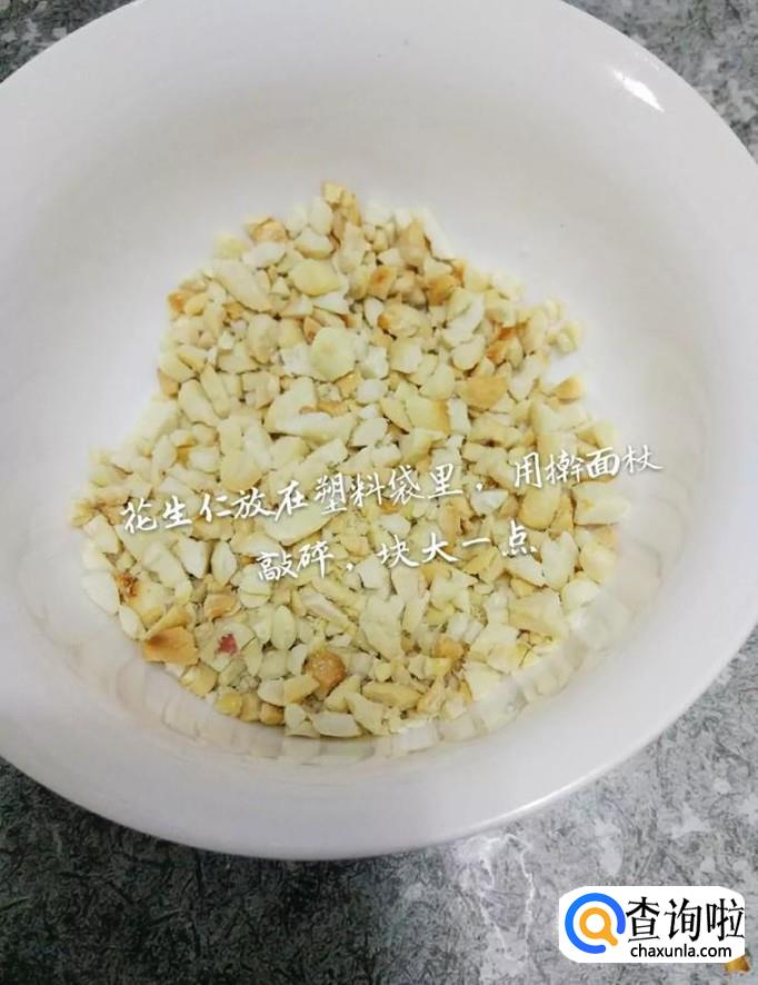 首先将花生米放到塑料袋中用擀面杖敲碎,挑去外皮,如下图所示。