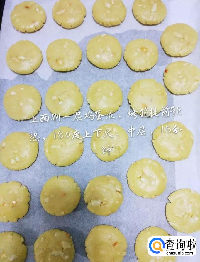 接着在小圆上面涂上一层蛋液,烤箱提前预热五分钟,之后开120°火烤15分钟,如下图所示。