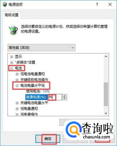 然后我们点击展开电池,然后我们点击展开电池电量水平低,然后我们将接通电源设置为90,之后我们点击应用,然后我们点击确定,之后我们的电脑就会开始充电了,因为我们的电脑默认的电池的电量往往是非常低的时候才会充电,所以我们需要设置高一些。